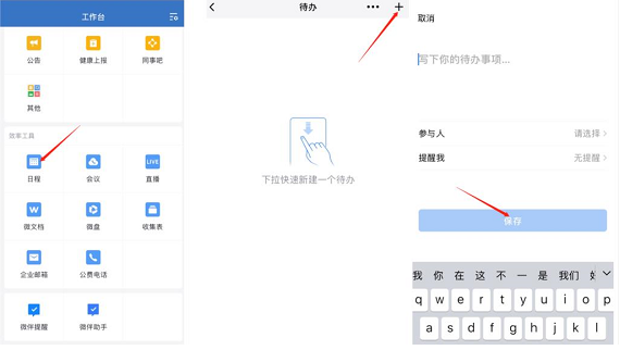 企業微信待辦事項提醒工具可提醒企業成員稍后處理某條消息,或對聊天成員設置活動提醒。而企業微信代辦事項提醒功能設置起來也很簡單,只需要點進企業微信,找到【工作臺】—【日程】,然后點擊右上角的“+”號就可以創建代辦,創建完成后就可以在設定好的時間收到待辦事項的提醒。